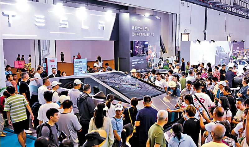 图片:中美将于10月24日至27日在马来西亚举行经贸磋商。图为4月17日,在海南举办的消费博览会上,参观者在美国公司特斯拉展位前观看展品。 /新华社