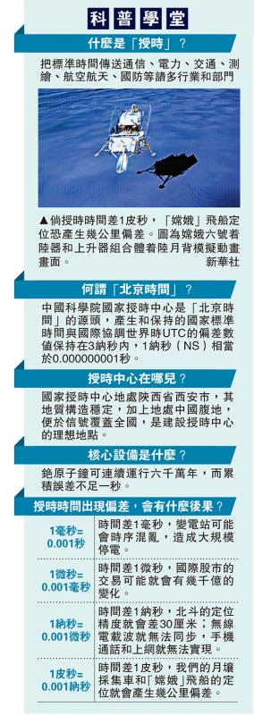 图:如果定时差1皮秒,“嫦娥”飞船的定位可偏移数公里。图片显示嫦娥六号着陆器和上升器组件在月球背面着陆的动画。 \ 新华社 什么是“时间”?向通信、电力、交通、测绘、航天、国防等众多行业和部门发送标准时间。什么是“北京时间”?中国科学院国家授时中心是“北京时间”的来源。建立和维护的国家标准时间与国际协调世界时间UTC的偏差量保持在3纳秒以内。 1 纳秒 (NS) 等于 0.000000001 秒。计时中心在哪里?国家授时中心位于陕西省西安市。地质结构稳定,地处中国腹地,有利于信号传输全国各地超额。是建设授时中心的理想地点。主要设备是什么?铯原子钟可以连续工作6000万年,累计误差小于1秒。如果时间出现偏差,会产生什么后果? 1 毫秒 = 0.001 秒。如果时间差达到1毫秒,变电站可能会出现定时干扰,导致大面积停电。 1 微秒 = 0.001 毫秒。如果时间差1微秒,国际股市交易就可以发生数千亿的变化。 1 纳秒 = 0.001 微秒。如果时间相差1纳秒,北斗的定位精度就会差30厘米;无线载波无法同步,无法实现手机通话和上网。 1 皮秒 = 0.001 纳秒。如果时间差为1皮秒,我们的月球陆地采集车和“嫦娥”飞船的定位就会我偏离了很多公里。
