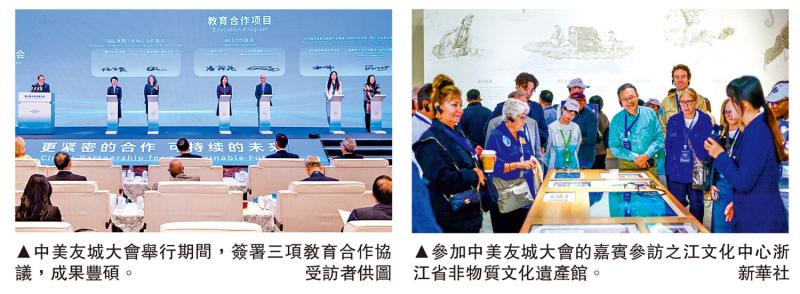 左图:帕果-萨-美城市会议期间,签署了三项教育合作协议,成果丰硕。 \ 照片由采访者提供;右:参加中美友好城市会议的嘉宾参观之江文化中心浙江省非物质文化遗产博物馆。新华社【大公报】记者王莉杭州报道:10月25日至27日,由中国人民对外友好协会、浙江省人民政府主办的第七届中美友好城市大会在浙江杭州举行。本届大会以“紧密合作,共创可持续未来”为主题,来自美国28个州36个县市的各界人士和中国26个省、自治区、直辖市的代表180余人参加。这是近年来规模最大、级别最高的本土中美交流活动t年。谢锋:通过“微循环”改善“大环境” 中国驻美国大使谢锋在习近平主席指挥的视频讲话中表示,“中美关系的希望在人民、基础在人民、未来在青年、活力在地方”。姐妹和姐妹国家关系是嵌入和整合这“四个维度”的重要载体。中美建交46年来,双方已结成288对友好省州、友好城市。他们不断凝聚人民希望、夯实人民基础、点燃青年梦想、激发当地活力,为中美关系稳定长远发展提供源源不断的活水源。关系。结合本次会议主题,他提出三点建议:一是相互理解、互利共赢。弘扬深入人心的中美友谊,用民间相通的温暖和活力化解相互障碍、打破影响。二是通过地方合作“微循环”,夯实基础,改善中美关系“大环境”。三是聚焦合作,共建中美关系可持续未来,携手推动两国实现共同繁荣。谢锋表示,我们要共同守护近半个世纪构建的城邦“朋友圈”和“关系网”,通过地方合作“微循环”改善中美关系“大环境”,为两国关系稳定改善注入不可替代动力。同时,他希望中美之间城市和城市的关系各省州将成为连接两国人民的跨太平洋桥梁,帮助中美两国沿着相互尊重、和平共处、合作共赢的方向前进。打破信息壁垒,不说“烂断丝” 中国人民对外友好协会会长杨万明表示,在当前中美关系面临挑战的背景下,中用友好城市所表现出的真诚友谊和合作愿望令人振奋,充分体现了姐妹姐妹的坚韧和热情。友好城市为中美两国人民相互理解、相互尊重搭建了重要桥梁。通过友好城市关系,中美两国人民克服了信息障碍。中美地方友城合作的现实有力地证明了““脱钩断链”不是现实理性的选择,对抗只会两败俱伤。会议期间设立了教育交流、城乡更新、可持续发展等专题论坛。中美双方共签署9项合作协议,涵盖深化友城、教育合作、工商合作等领域。会后,第七次中美“杭州共识” 还发布了城市大会,呼吁中美两国各界有识之士更加积极支持和参与友城合作,在各种困难和挑战下推动友城合作。进一步拓展人文、教育、青年等领域合作,共同为中美关系稳定健康可持续发展作出积极贡献。