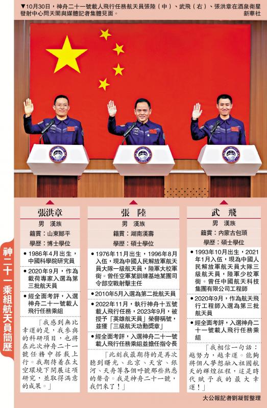 图片:10月30日,神舟二十一号载人飞行任务航天员张璐(中)、吴飞(右)、张宏章在酒泉卫星发射中心问天阁会见媒体记者。中国天宫空间站新华社即将迎来新的“太空商务之旅”三人组。中国航天工程新闻发言人张静波30日表示,经任务指挥部研究决定,神舟二十一号载人飞船将于北京时间10月31日23时44分发射。神舟二十一号任务的航天员由张鹭、吴飞、张鸿章组成,张鹭担任指挥员。他们将在太空停留6个月,并在轨道上执行27个新的科学和应用项目。其中,1993年出生的吴飞是目前中国航天员队伍中最年轻的航天员。此外,张静波还公布了香港宇航员的最新消息。他表示,两名港澳航天员加入团队后,各项工作进展顺利。他们按计划完成了航天相关基础理论知识的学习和多项基础演练,并将针对未来的飞行任务进行强化训练。 \ 大公报记者刘宁哲张静波介绍,执行神舟二十一号载人飞行任务的三位航天员张璐、吴飞、张宏章分别是航天飞行员、飞行工程师、装载专家。这是继神舟十六号航天员机组后第三个由三种类型组成的航天员机组,涵盖“70后”、“80后”、“90后”三个年龄段。航天员张璐驾驶神舟十五号载人飞行任务,而吴飞和张宏章都是首次飞行任务。其中,吴飞入选前曾任中国航天科技集团公司空间技术研究院工程师,查吴宏章入选前是中国科学院大连化学物理研究所研究员。有效载荷专家搭载自主研发项目“飞天”,作为目前执行飞行任务的最年轻的中国航天员,吴飞表示,天地往返常态化,让年轻一代有更多、更早的为国奋斗的机会。作为有效载荷专家,张宏章透露,他参与的研究项目将在神舟二十一号任务上进行,他希望能够在太空环境下开展研究,并取得满意的结果。此次任务是空间站应用研制阶段的第六次任务,也是载人航天工程的第37次任务。张静波指出,本次任务的主要目的是与神舟二十号乘组完成在轨轮换,在空间站停留约6个月,约开展空间科学与应用工作,开展航天员出舱活动和货物进出,开展空间碎片防护装置、出舱载荷和出舱设施设备安装等任务,开展科普教育和公益活动,增长测试空间载荷,持续发挥空间站应用综合效益最大化。按照计划,神二十一号飞船入轨后,将接受自主快速交会对接模式,在3.5小时左右与天河核心舱前港对接,形成三船三舱组合。在轨运行半年多的神舟二十号机组在与神二十一号机组完成在轨轮换后返回东风着陆场。港澳航天员完成沙漠生存等训练科目。此外,香港载人航天工程也正式启动。官方还公布了香港航天员的最新消息。张静波表示,两名港澳航天员入队后,很快融入航天员队伍,各项工作进展顺利。目前,该队已按计划完成了多项涉及基础理论知识和体能、心理、航天环境适应能力等方面的航天基础演练,目前正在进行航天专业技术培训。期间还完成了沙漠生存、发起紧急现场疏散等具有挑战性的训练课题。任务技能不断提高,基本体能、抗压能力等身心特征得到较大提高,总体状况良好。后续将安排两名港澳航天员进行强化任务训练,确保满足各项要求nts 执行任务。 “我们期待他们一起惊艳亮相。”张静波说道。