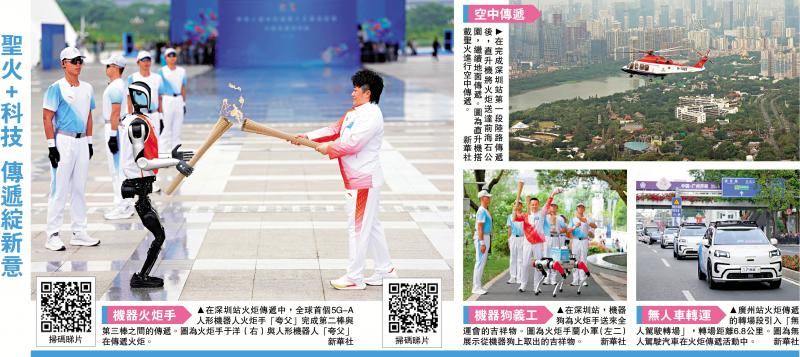图片:火炬+科技接力带来新思路 第十五届全运会(以下简称“全运会”)火炬传递2日在香港、澳门、广州、深圳四城市同时举行。当日,在深圳市民广场,“零号火炬手”机器人“夸父”继续从北京奥运会羽毛球女双金牌得主于洋手中接过圣火。跑完100米后,传递给下一位火炬手。整个过程顺利、顺利。 “夸父”成为世界上第一个完成火炬传递的人形机器人。从深海采集的“火火”到四城“火炬”传递,深圳站、广州站均采用智能机器人,无节无节,彰显了粤港澳大湾区作为国际科技转化科技与体育的产业优势。 \ 大公报记者胡永爱,李伟和帅成报道,这次传输突破了传统,融入了多项高科技手段。上午9点,火炬接力启动仪式在深圳莲花山公园举行。南方科技大学校长、中国科学院院士薛其坤接过第一棒。他高举火炬,从深圳莲花山公园站起来。第二位火炬手是北京奥运会羽毛球女双冠军于洋。下一位火炬手是充分展现深圳科技“硬实力”的“火炬手0号”,以及全球首款5G-A人形机器人“夸父”。机器狗快递运送全运会吉祥物。作为首个5G-A类人机器人火炬手,“夸父”以高度拟人化的跑姿,单臂负重1.6公斤,成功完成了第二极和第三极的转换,成为现代科技的一大亮点。这场全国比赛中的技术。 “夸父”由深圳本土公司乐居机器人研发,搭载开源鸿蒙操作系统。它是国内首款能够在多种地形上跳跃和行走的同类产品。除了机器人之外,机器狗也“亮相”火炬传递深圳站。大公报记者看到,火炬手经过后,机器狗会四足走向火炬手,送上国家吉祥物,为即将到来的全运会增添了气氛。全运会火炬接力深圳站全长45公里。此次接力赛以“山海相连的大龙站”为基本理念,创新性地采用陆空联动的方式,立体展示深圳城市特色。完成首次1公里陆地接力后,承载奥运会国家火炬的直升机从莲花山公园风筝广场升起沿深圳湾滨海区向西行驶,途经深圳多个地标、蛇口渔港、腾讯企鹅岛。它沿着粤港澳大湾区变革的主走廊飞行,最终到达前海石材公园桂湾片区,火炬回到地面继续传递。广州站火炬传递活动以“千年长江之城,新多彩广州”为主题,在越秀公园镇海楼举行,这里是广州老中轴线的制高点。从城市传统中轴线走向新中轴线,连接历史地标和现代风貌,换乘路线总长11.6公里,其中运营换乘4.8公里,驾车换乘6.8公里。值得一提的是,在换乘路段,从越秀公园西门至广东省体育场,里程6.8公里,“无人监管”创新推出了“sed驾驶转移”。这款无人驾驶汽车是小马智行与广汽集团基于广汽Aion第二代AION V霸王龙共同开发的。小马智行副总裁、广深研发中心负责人莫鲁一表示:“参加火炬传递、完全无人驾驶,不仅对车辆的安全性、稳定性和可靠性提出了很高的要求,也对车辆的安全性、稳定性和可靠性提出了更高的要求。车辆,以及我们的第二和第三名机组人员以及整个慢速车队。莫鲁一强调,“为了确保火光护航顺利完成,我们制定了很多应急预案,包括路线缩减、车队驾驶方式、极限场景场景、系统优化等,最终车辆零误差完成了火光护航。”当日下午,来自香港、澳门、广州、深圳四座城市的圣火齐聚广州,举行全国火炬接力与我会。奠基仪式在广东奥林匹克体育中心举行。