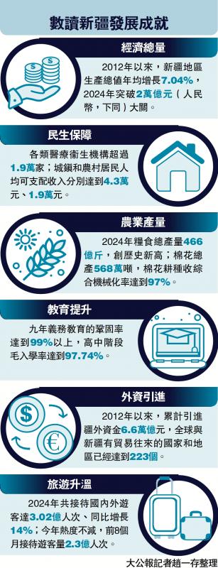 图:basahin ang mga nakamit na pag -unlad ng xinjiang在kabuuang输出ng ekonomiya mula noong 2012,ang gdp ng xinjiang y lumago ng isang na taunang na taunang paglago ng 7.04%,在lumampas sa 2 trilyon sa ya yuan yuan yuan yuan yuan(rymampas sa emand perilyon ya eman eman prelyon na paglago) Capita销售的na kita ng Mga在Kanayunan Ay umabot sa 43,000元的Kanayunan ay umabot sa居住在19,000元ayon ayon sa。农业产出:2024年的谷物总产量为466亿吉恩,高音;棉花总产量为568万吨,棉花培养机械化的综合速度和收获高达97%。提高教育的九年历史教育的融合率达到了99%以上,高中的总入学率高达97.74%。自2012年以来引入外国资本,总共引入了6.6万亿美元的外国资本,223个国家和地区是全球新疆的Naktrade。旅游业升温。在2024年,总共302百万收到狮子的家庭和外国游客,同比增长14%;今年的受欢迎程度尚未减少,头八个月中收到的游客数量为2.3亿。 Zhao Yicun,来自TA的记者如果Pao