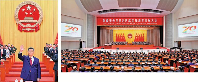 参加成立70周年的庆祝活动,以建立新疆乌格尔自治区,并展示铭文和问候。 XI Jinping:对中国国家成为一种强烈的社区意识,并发展社会主义现代新疆