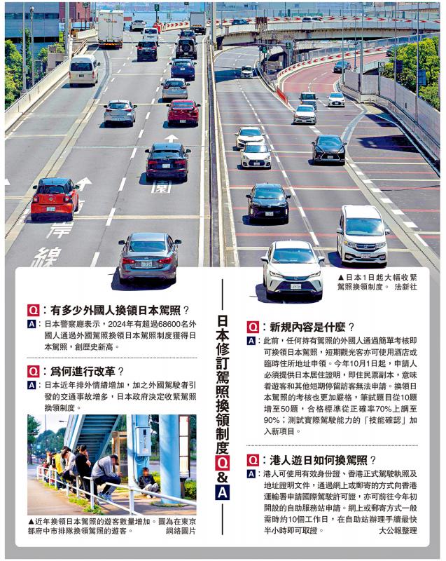 上图:日本将从1日开始大大关闭驾驶执照的更新系统。 \ afp;下图:近年来,改变日本驾驶执照的游客数量有所增加。图片显示,游客排在线,以更改东京富图市的驾驶执照。 \ Internet图片问:有多少外国人改变了日本驾驶执照?答:日本警察局说,2024年,超过68,600名外国人通过外国驾驶执照系统获得了日本驾驶执照,这创造了很高的记录。问:为什么要改革?答:近年来日本增加了仇外心理,外国驾驶员造成的交通事故增加。日本政府决定收紧驾驶执照更换系统。问:什么是尼尔诺的新法规?答:以前,任何持有驾驶执照的外国人都可以通过简单的评估来改变其日本驾驶执照。短期游客也可以使用酒店或居住地址申请。从今年10月1日开始,申请人应在下午提供居住证书,即住院票的副本,这意味着游客和其他短期客人无法申请。更改日本驾驶执照的分析也更加严格。书面测试问题从10个问题增加到50个问题,通行标准从70%的准确性提高到90%;测试实际驾驶能力的“技能确认”已添加到新项目中。问:如何在前往香港的旅行期间更改驾驶执照?答:香港人们可以使用有效的身份证,香港的官方驾驶执照和地址证书,以在线或邮寄的香港运输部申请国际驾驶执照,或者前往今年年初开放的自助服务站。在线或邮寄程序通常需要大约10个工作日,并且该证书可以在半小时内快速在自助服务站收集。如果pao的汇编