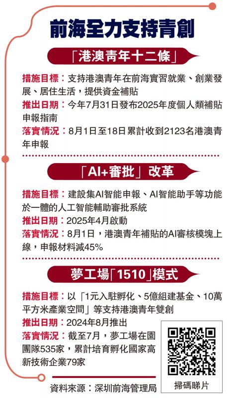 照片:ICAN的代码观看电影“香港和澳门青年的十二篇文章”的步骤和目标:支持香港和澳门青年实习,企业家精神和发展,并居住在Qianhai,并提供金融补贴。发布日期:今年7月31日发布2025年个人补贴申请指南。实施状态:8月1日至18日收到了2,123个香港和澳门青年的总和。提案和目标:通过接近包括AI智能宣言,AI智能助理和其他行动的系统,开发一种在辅助系统的人工智能中。日期发布:于2025年4月启动。实施状态:8月1日,启动了香港和澳门青年补贴的AI审查模块,并将应用材料降低了45%。 “ 1510” DreamWorks'的建议和目标:SUP向香港和澳门青年创新进行“ 1元居住在孵化中,5亿元人民币生成了一项基金,我有100,000平方米的INddlustrial Space”和其他运营。发布日期:于2024年8月推出。发布日期:2024年8月发射。实施状态:7月,DreamWorks在公园里有535个公园,并培养和消除了79个国家高科技企业。来源