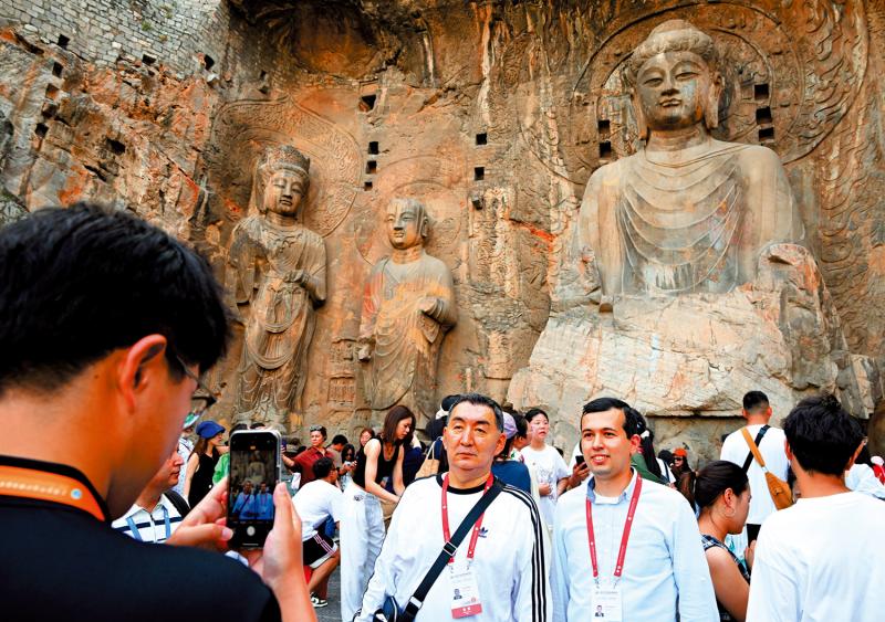 照片:CPC中央委员会秘书长XI Jinping在第29位强调,有必要系统地促进我们国家的宗教宗教。图片显示在上海合作组织媒体智囊团峰会上的客人在7月26日在Luoyang City的Longmen Grottoes拍照。\ Xinhua新闻社